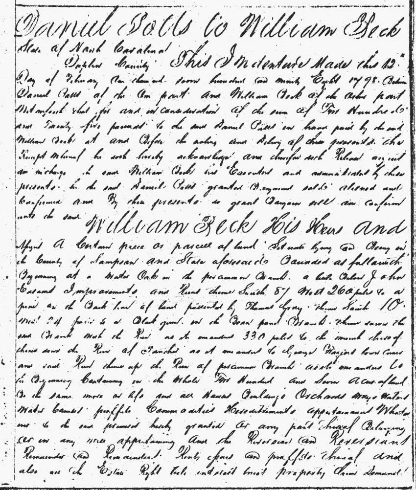 Daniel Potts to William Beck, (heading says Duplin County) - £225 for 207 acres in Sampson County beginning in the percimmon branch a little below John Easoms improvements and adjacent to back line of land pattented by Thomas Gray, mouth of Bear Pond Branch (apparently emptied into the run of Panther), and the run of Panther as it meanders to George Fraziers lower corner. Sampson County Register of Deeds Images