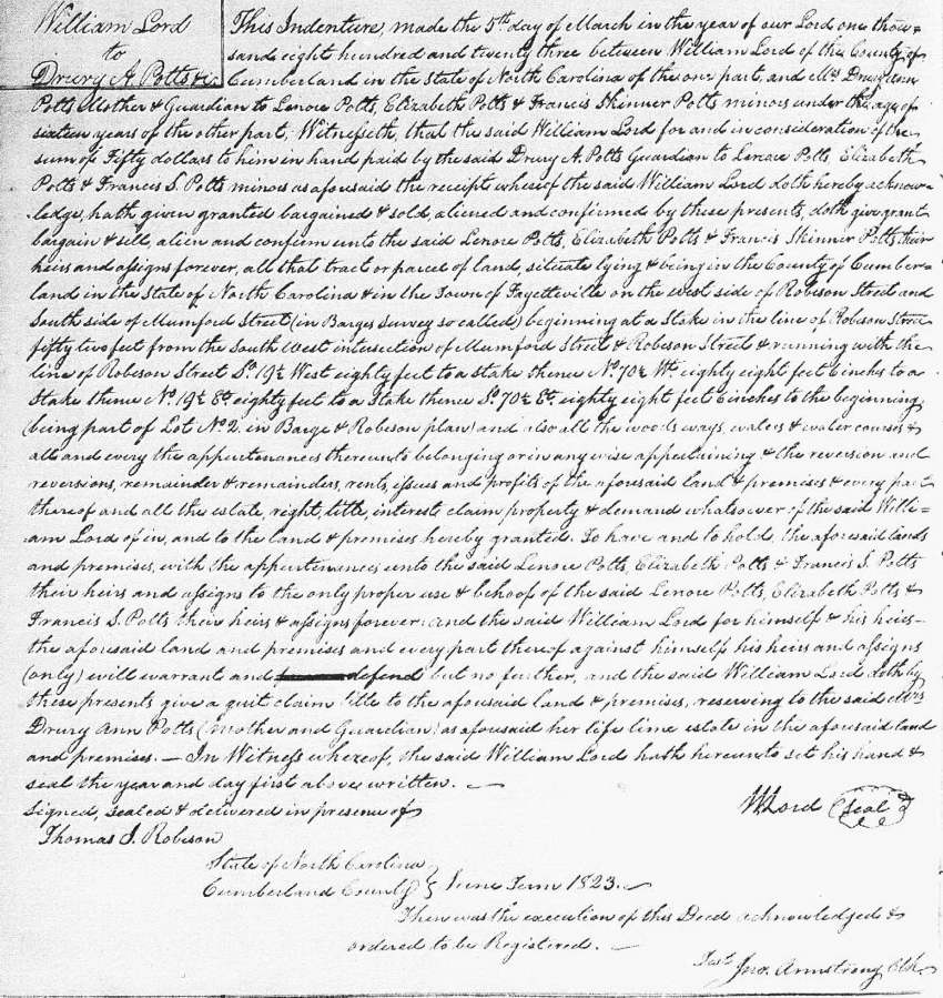 5 Mar 1823 - William Lord deed to Mrs. Drury Ann Potts Mother & Guardian to Lenore Potts, Elizabeth Potts & Francis Skinner Potts, minors under the age of 16 years - $50 - land in Cumberland County in the town of Fayetteville on the west side of Robeson Street and south side of Mumford Street (being part of Lot No. 2 in Barge & Robeson plan) along with all the woods, ways, waters & water courses to the proper use & behoof of the said Lenore Potts, Elizabeth Potts & Francis S. Potts.